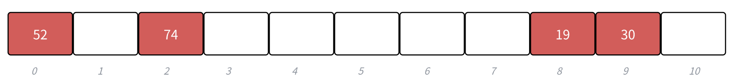 - 下面演示{19,30,52,74}等这一组值映射到M=11的表中,设h(key)=key%10+1