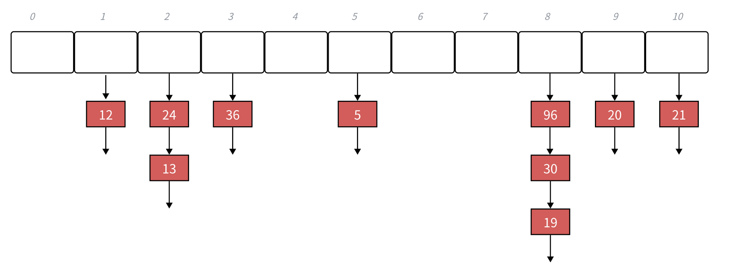下面演示{19,30,5,36,13,20,21,12,24,96}等这一组值映射到M=11的表中。