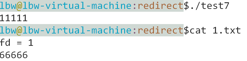 close(1);int fd = open("1.txt", O_WRONLY | O_CREAT|O_TRUNC, 0666); printf("fd = %d\n", fd); write(fd, "66666\n", 6); close(fd); return 0;}