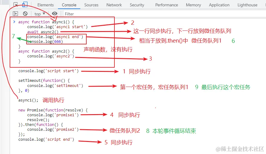 await async2() // await这一行,这个async2 同步执行的; await的下面,放到微任务队列