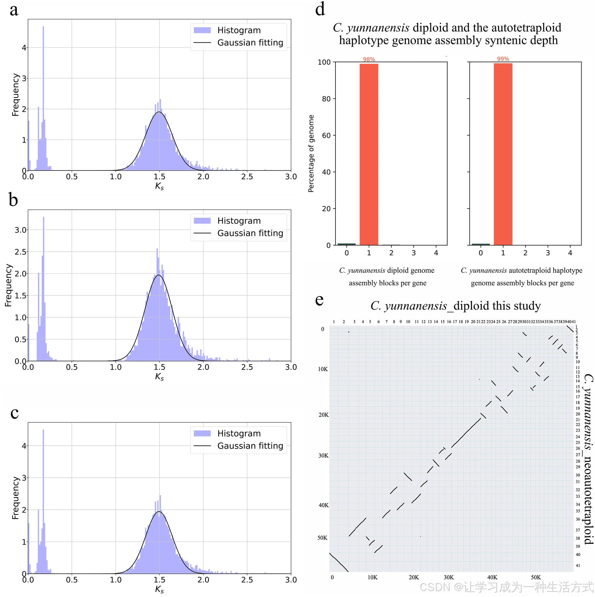 滇桐新生同源四倍体与滇桐二倍体(本研究)的比较分析。(a) 二倍体基因组组装中旁系同源基因对的 Ks 峰值;(b) 同源四倍体单倍型基因组组装中旁系同源基因对的 Ks 峰值;(c) 二倍体与同源四倍体单倍型基因组间直系同源基因对的 Ks 峰值;(d) 二倍体与同源四倍体单倍型基因组的共线性深度比值;(e) 二倍体与同源四倍体单倍型基因组比对分析的共线性点阵图。