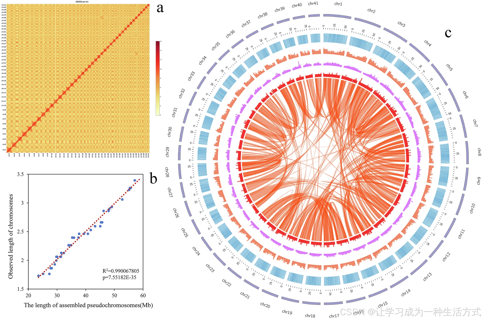 为验证组装质量,我们将体细胞中 41 对染色体的物理长度与组装长度进行比较。结果显示二者高度一致,相关系数为 0.99 ,p 值为 7.55e-35 ,表明存在极强的正相关关系(图 3b)。
