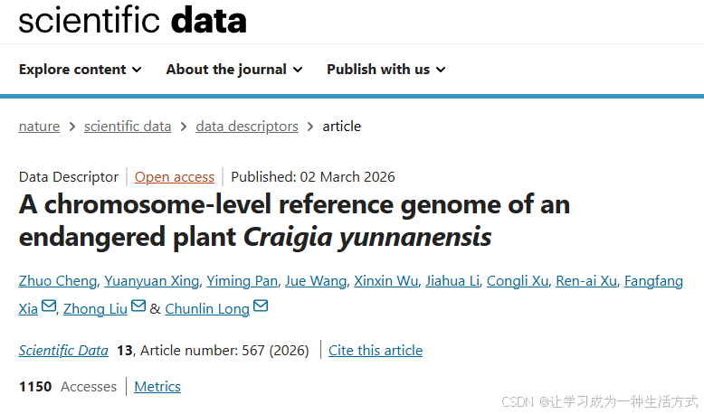 本研究产生的所有原始测序数据已提交至美国国家生物技术信息中心(NCBI)的序列读取存档(SRA)数据库,对应的生物项目编号 为 PRJNA1327616 。HiFi、Hi-C、Illumina 及 RNA-seq 测序数据集的存档编号分别为:SRR3538602434、SRR3621621835、SRR3537130836、SRR3636973337。