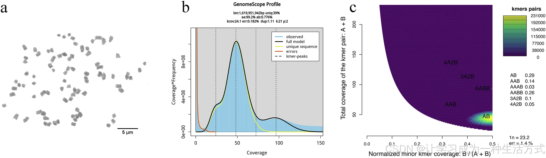 (a) 滇桐染色体核型分析;(b) 基于 21-mer 分布的基因组大小预估;(c) 利用 Smudgeplot 工具进行倍性推断。
