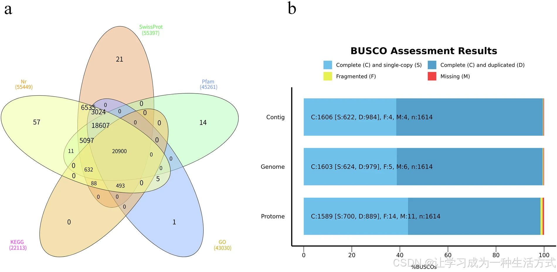 (a) 滇桐蛋白质组注释结果统计(b) 滇桐基因组 contig 水平、染色体水平及蛋白质组的 BUSCO 评估