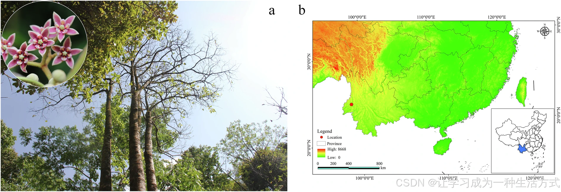 (a) 滇桐形态特征;(b) 样本采集地理位置。