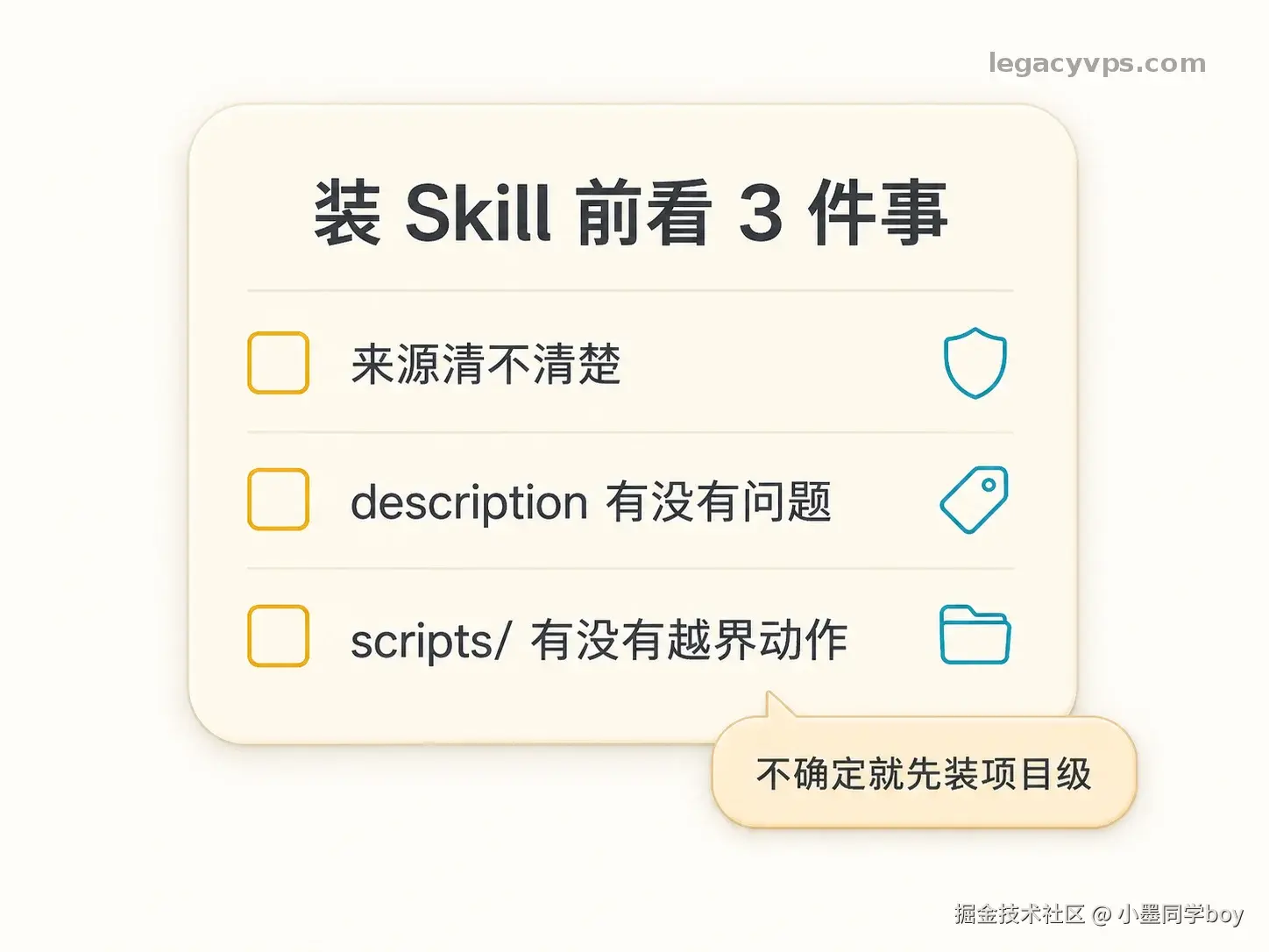 策略上,不确定安不安全的 Skill,先装项目级------只在当前项目里生效,出了问题影响范围小,确认没问题再放全局。