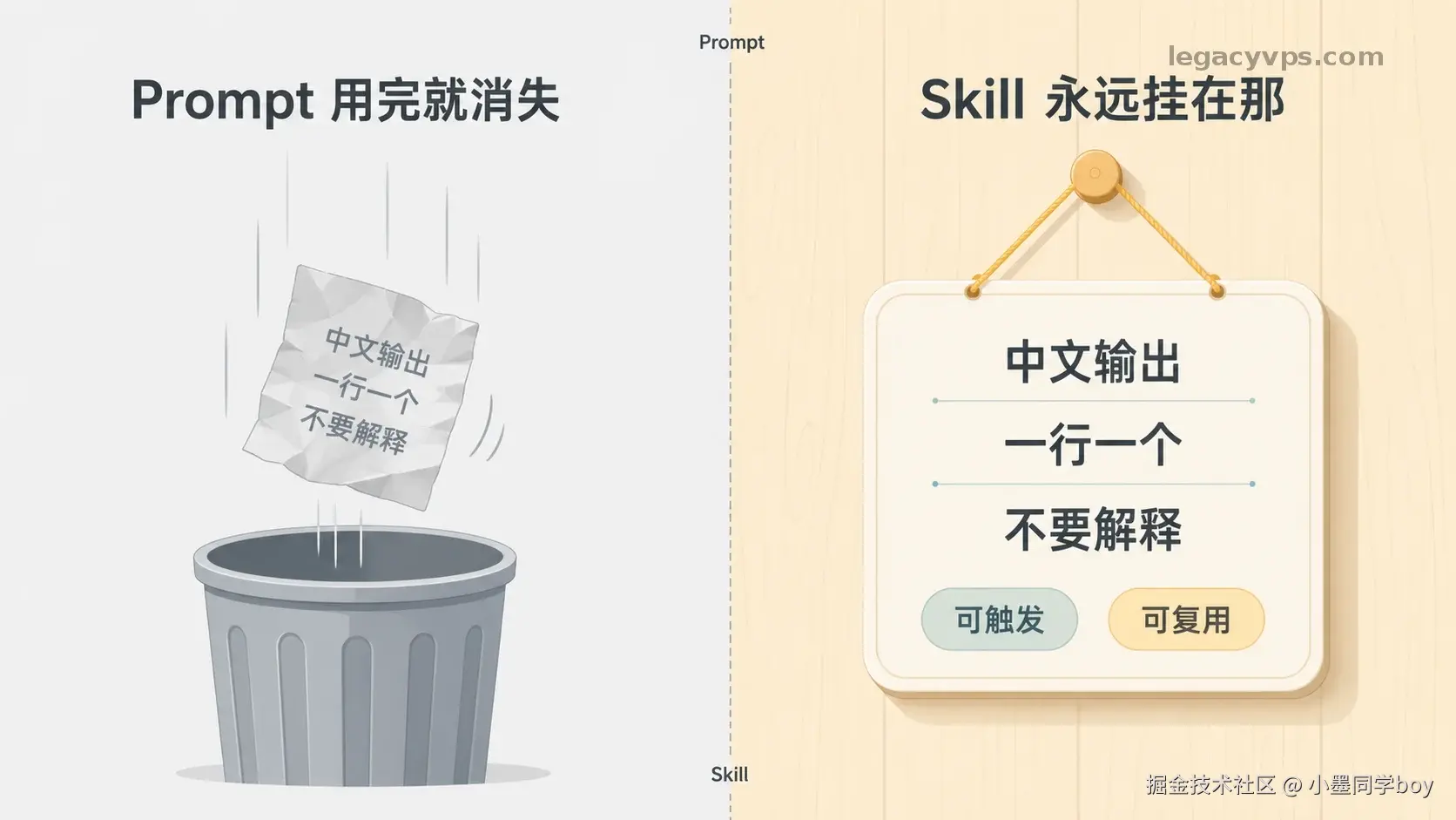 说白了:Prompt 是便条纸,用完扔;Skill 是挂在柜台后面的操作卡,永远在那。