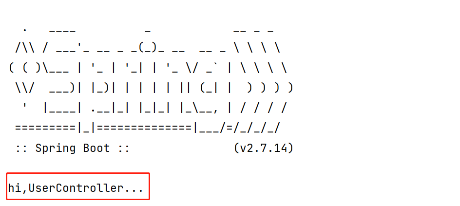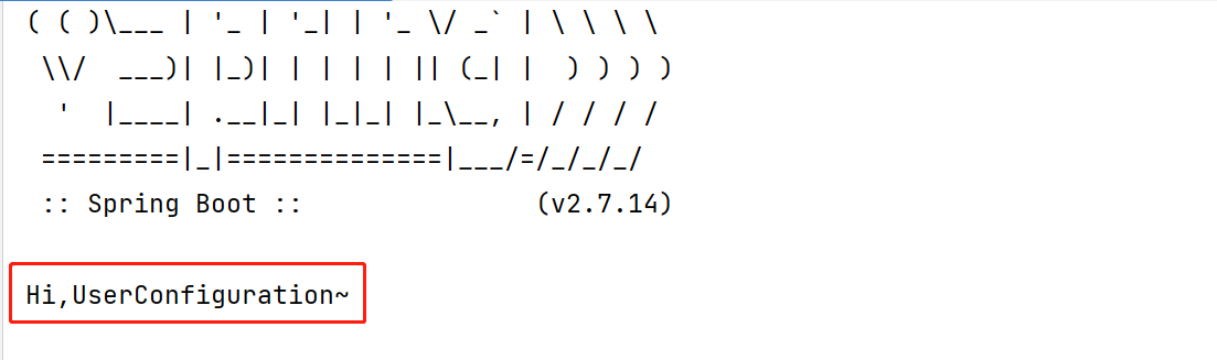 观察运⾏结果,发现成功从Spring中获取到UserConfiguration对象,并执⾏UserConfiguration的 sayHi⽅法