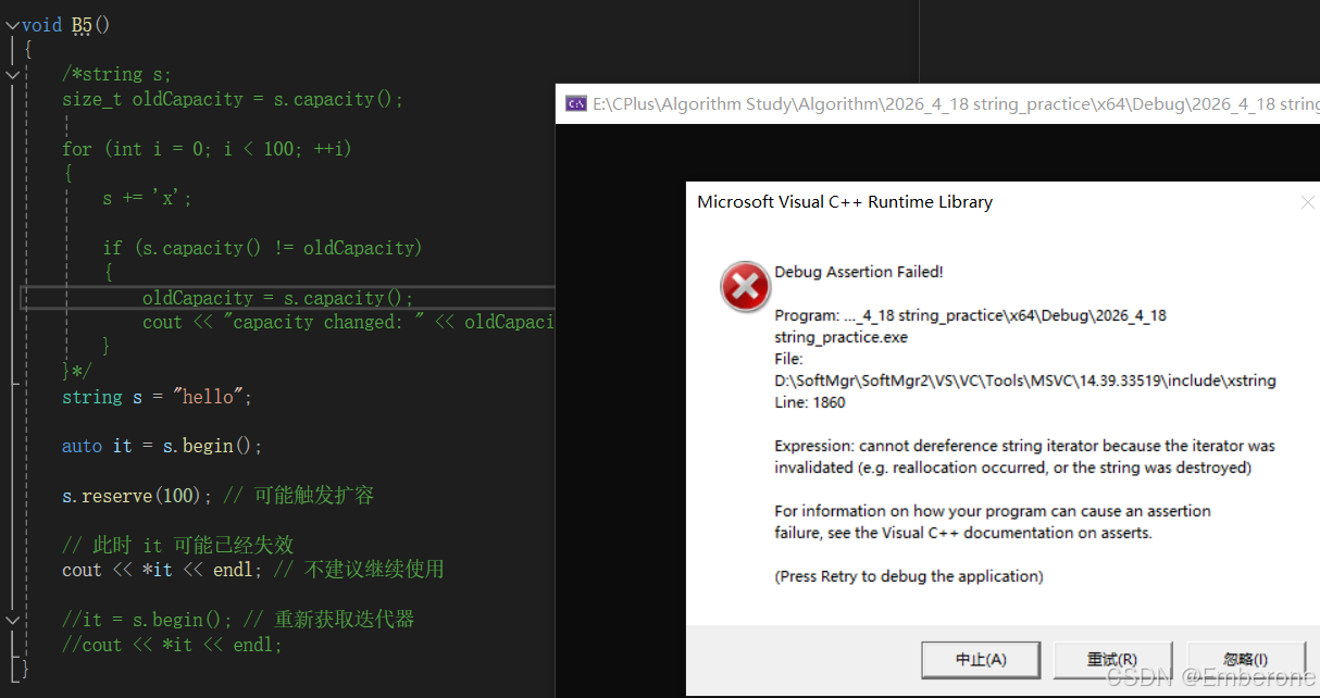 size()/length()表示有效字符个数。capacity()表示当前容量,不一定等于size()。clear()只清空内容,不保证释放空间。reserve(n)用于提前预留空间,减少频繁扩容。resize(n)会改变有效字符个数,必要时会触发扩容。- 扩容后的容量不一定刚好等于 n,具体增长策略取决于标准库实现