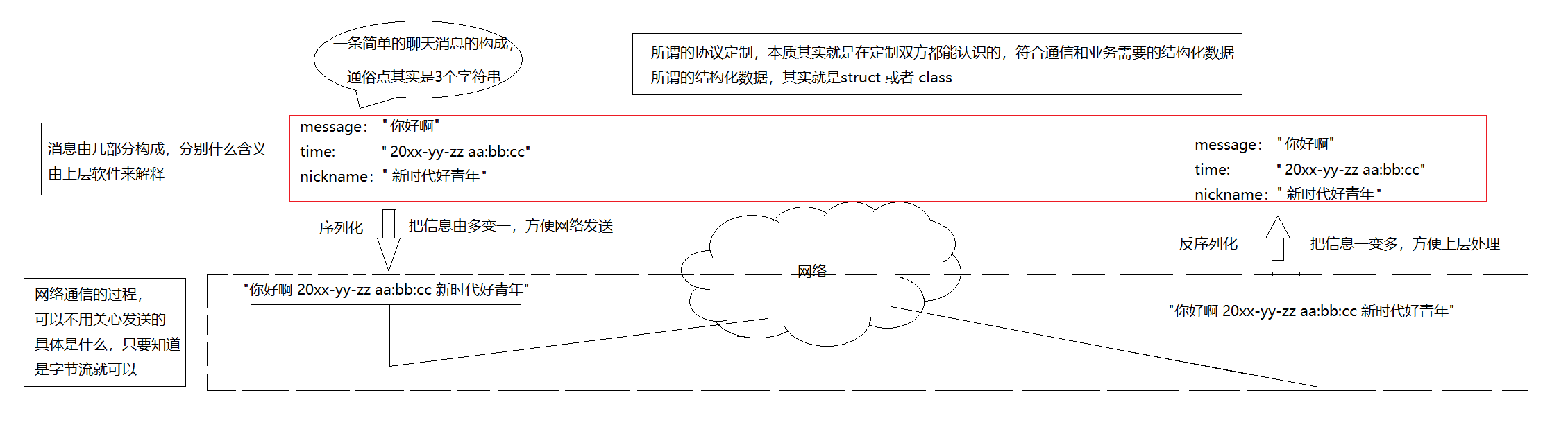 协议为所有通信设备制定了统一传输规则,通信数据需要按照网络规范进行封包处理,才能在网络中正常传输。序列化 是将应用层原始结构化数据、对象转换为可传输字节流的过程;反序列化则是接收端将传输的字节流,还原为原始业务数据的过程。