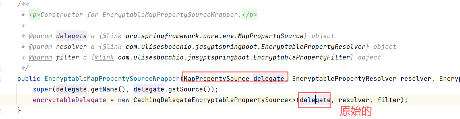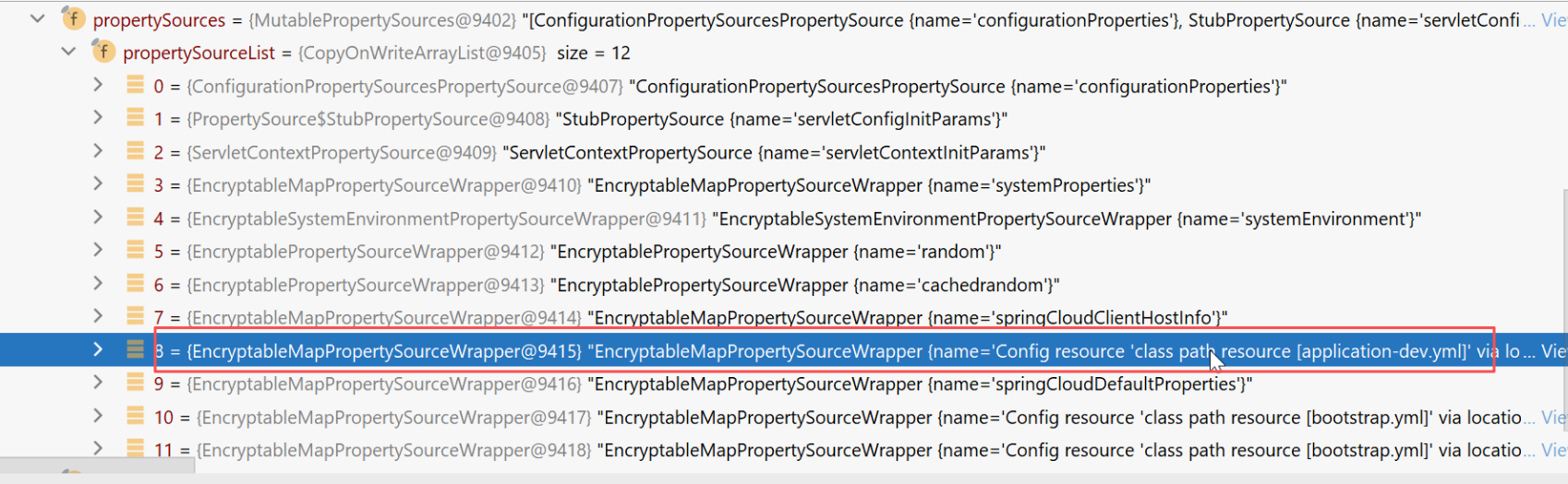 上图所示,是有一个classpath下的resource:application-dev.yml。这个propertySource的类型是com.ulisesbocchio.jasyptspringboot.wrapper.EncryptableMapPropertySourceWrapper,大家可能有点奇怪,不熟悉这个类,这个是因为我们项目在生产环境里,对配置文件中的值进行了加密(比如数据库密码)。
