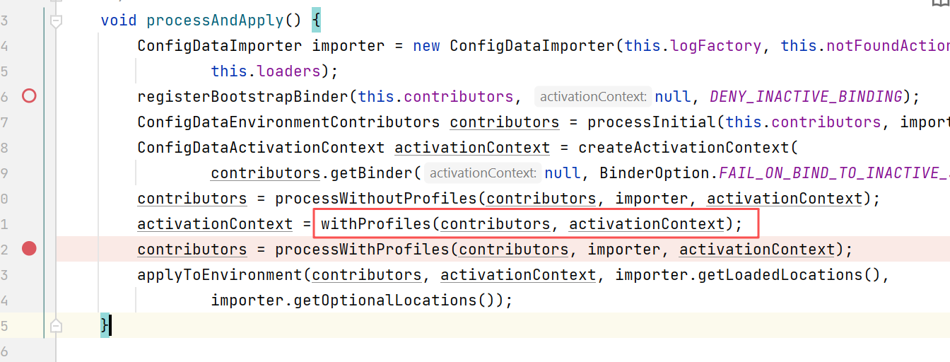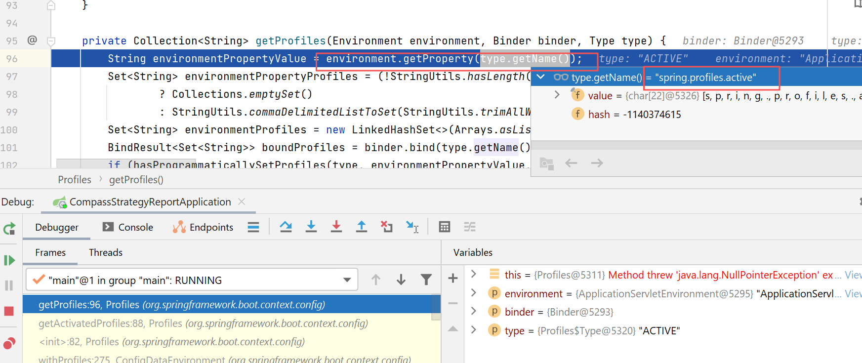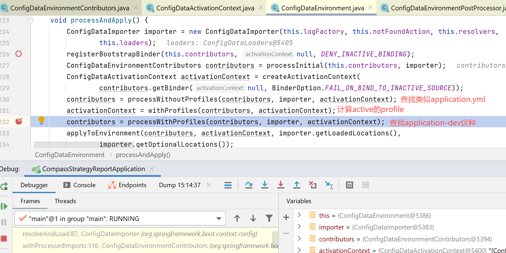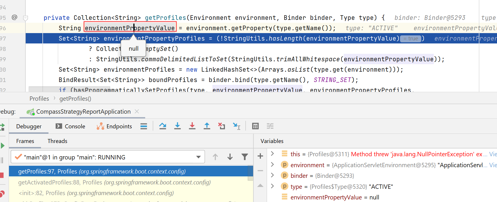 后来经过反复对比正常和异常情况下的代码路径,发现异常情况下,计算出来的active的profile竟然是空的。正常情况下,profile是dev。
