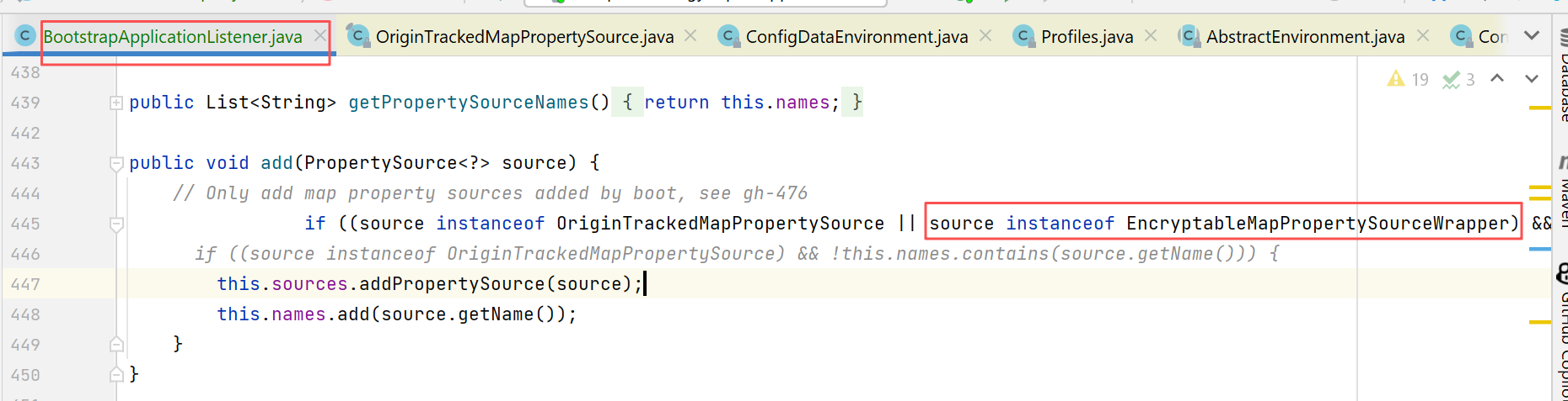 发现会判断propertySource是不是OriginTrackedMapPropertySource类型,而我们知道的是,那个加密组件,会把正常的OriginTrackedMapPropertySource类型的propertySource转成EncryptableMapPropertySourceWrapper,而这个EncryptableMapPropertySourceWrapper就不是OriginTrackedMapPropertySource的子类,所以这里就没法加入到names数组。