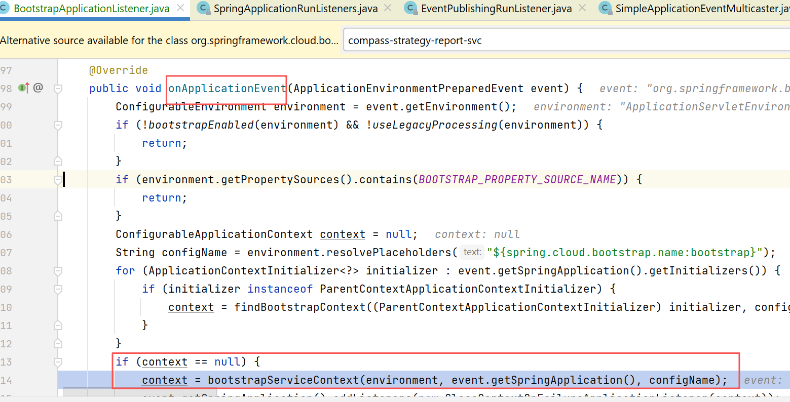 上述这个方法什么时候调用的呢,其实就是在上文说的,applicationContext这个上下文完成了environmentPrepared后,就会发布一个org.springframework.boot.context.event.ApplicationEnvironmentPreparedEvent,这时候各个listener就会处理这个事件。