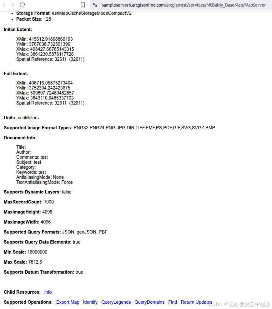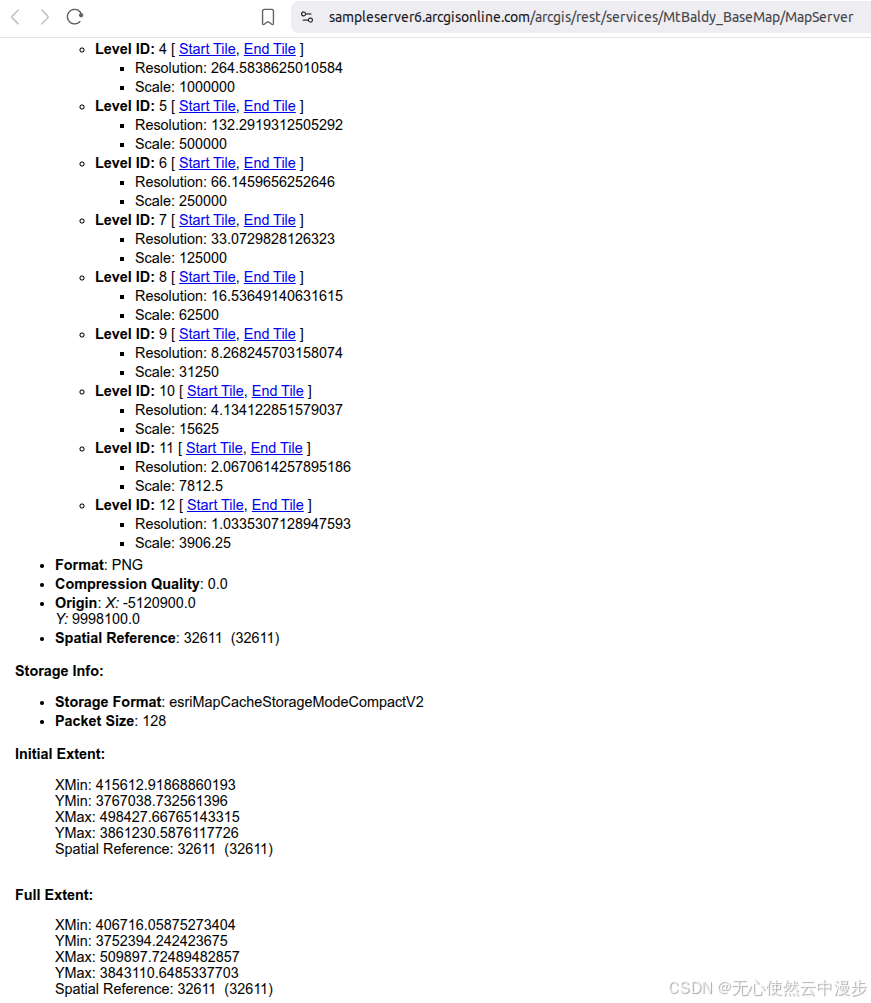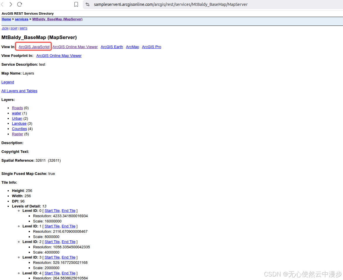 判断一个ArcGis地图服务是否可以使用切片形式调用,可以查看地图服务的基本信息,比如ArcGis官方服务1