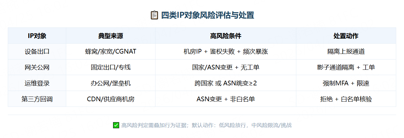 | IP对象 | 典型来源 | 主要风险 | 误封代价 |