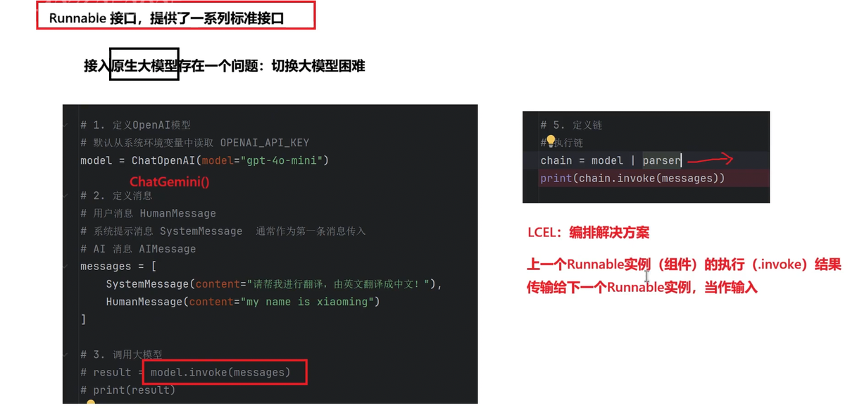 通过上述步骤,无论是调用大模型,还是输出解析,我们发现,每次都调用了一个 invoke() 方法,最 终才会得到我们想要的结果。