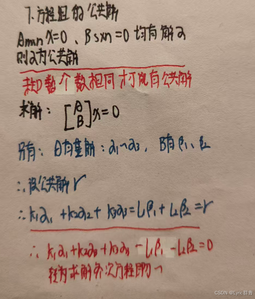 - 非齐次方程:系数矩阵的秩小于增广矩阵的秩,无解;系数矩阵的秩等于增广矩阵的秩,则当两者等于矩阵的阶数时有唯一解,小于阶数就是无穷解