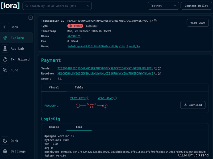通过 Lora,可以在 Testnet 上确认该笔交易已成功,并查看编译后的逻辑签名:
