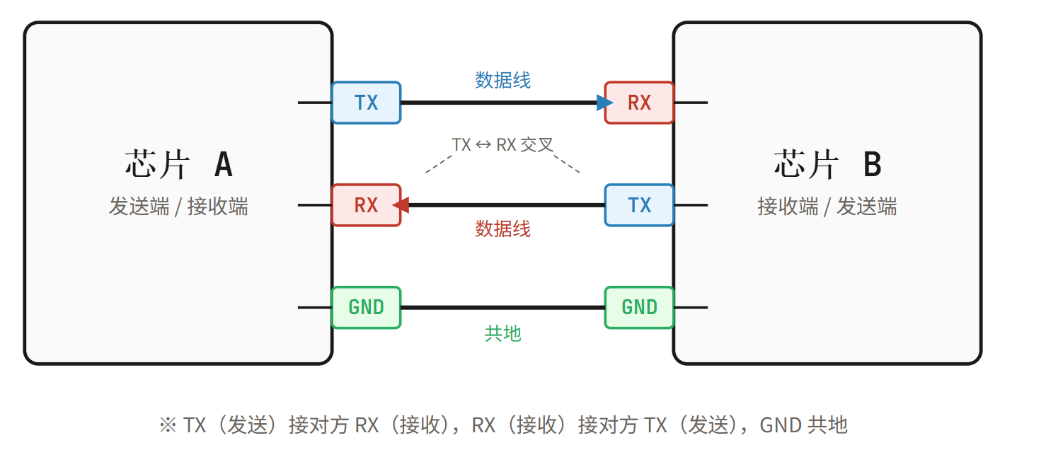 最基础的串口通信只需要两根信号线:TX(Transmit) :发送数据;RX(Receive) :接收数据。UART 数据传输是全双工的,通信双方可以同时发送和接收数据。此外发送和接收双方需要共地以保证参考电平一致。连线方式示意图如下。