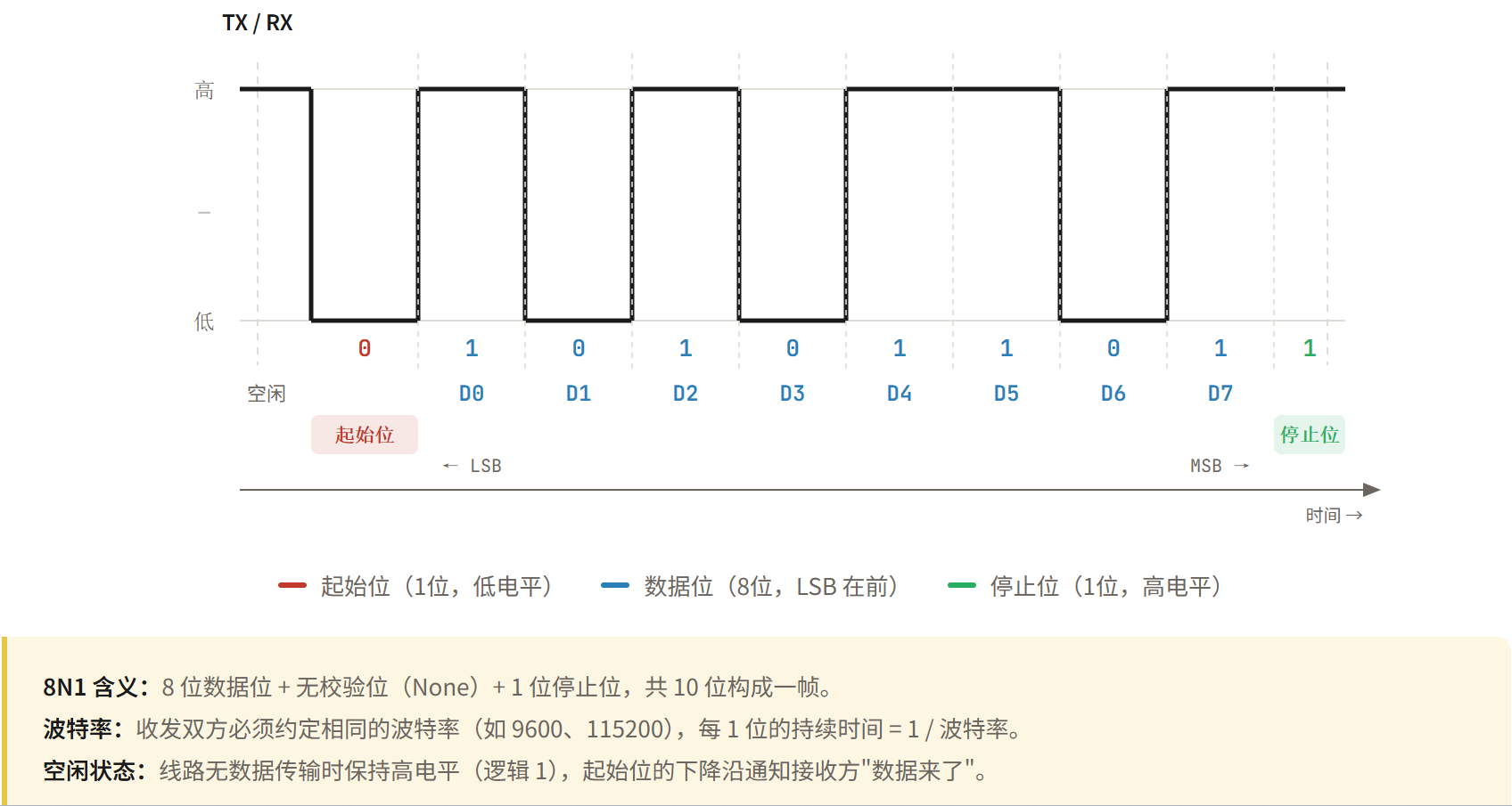 串口(UART)是嵌入式系统中最基础最常用的通信方式之一,简单,通用并且无需时钟同步。串口通信是一种异步串行通信方式,数据按位(bit)依次传输,每次传输一个字节(通常为8位)。由于是异步通信,通信双方不共享时钟信号,而是通过约定好的参数来保证数据正确接收。