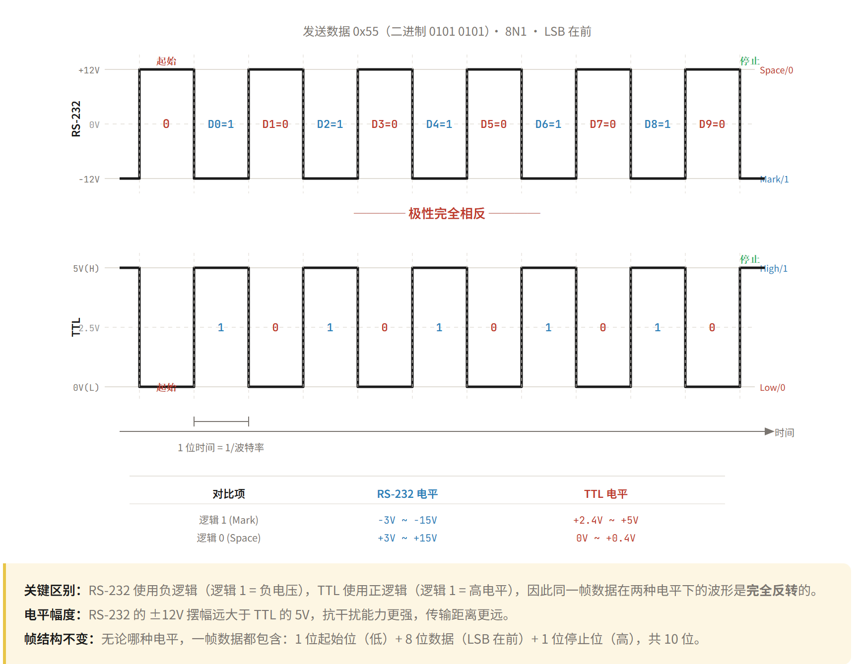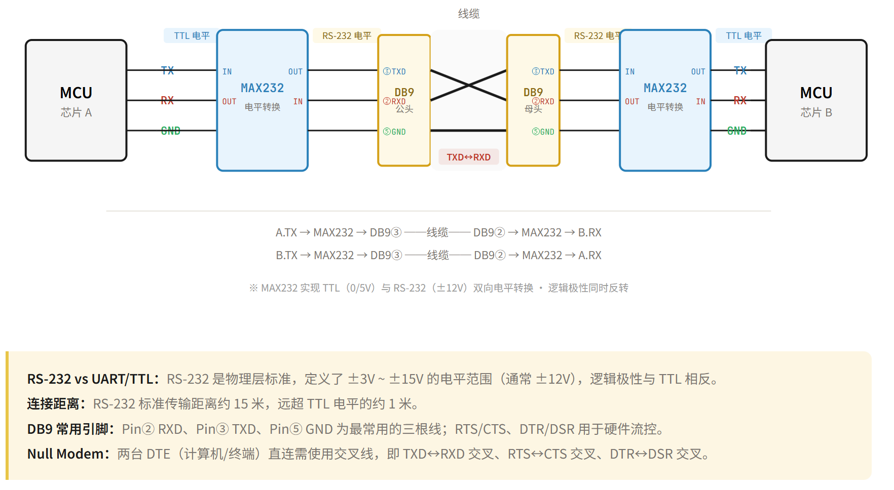为了解决基本串口通信在传输距离和抗干扰能力以及通信规模等方面的限制,逐渐发展出了 RS232 和 RS485 等更完善的串行通信标准。需要注意的是,这些标准并不是对 UART 协议的替代,而是在物理层对其电气特性进行改善,从而提升通信性能和适用范围。