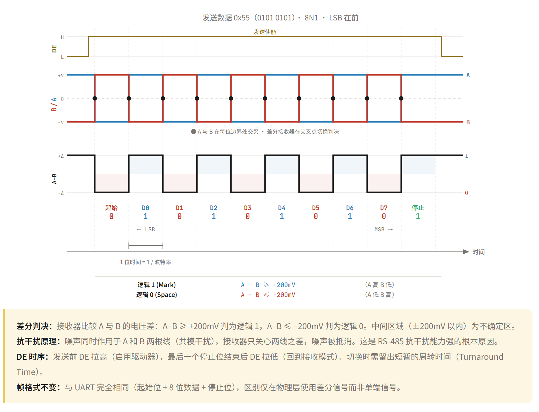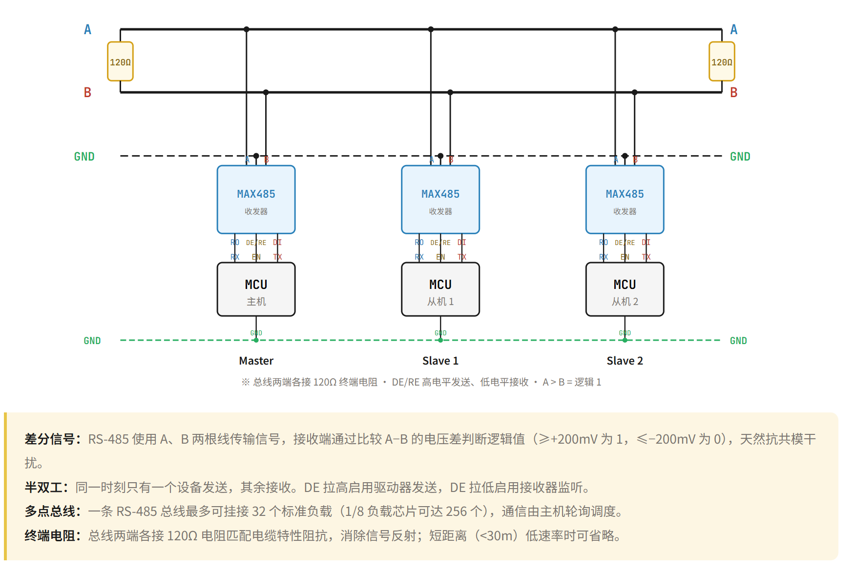 由于 RS485 采用了差分信号传输,一位信号的表示需要两根线的电位差来判断,因此其仅支持半双工通信。差分信号采用两根线来进行信号传输,接收设备通过两根线的电压差判断逻辑值(≥+200mV 为 1,≤−200mV 为 0),因此天然抗共模干扰。
