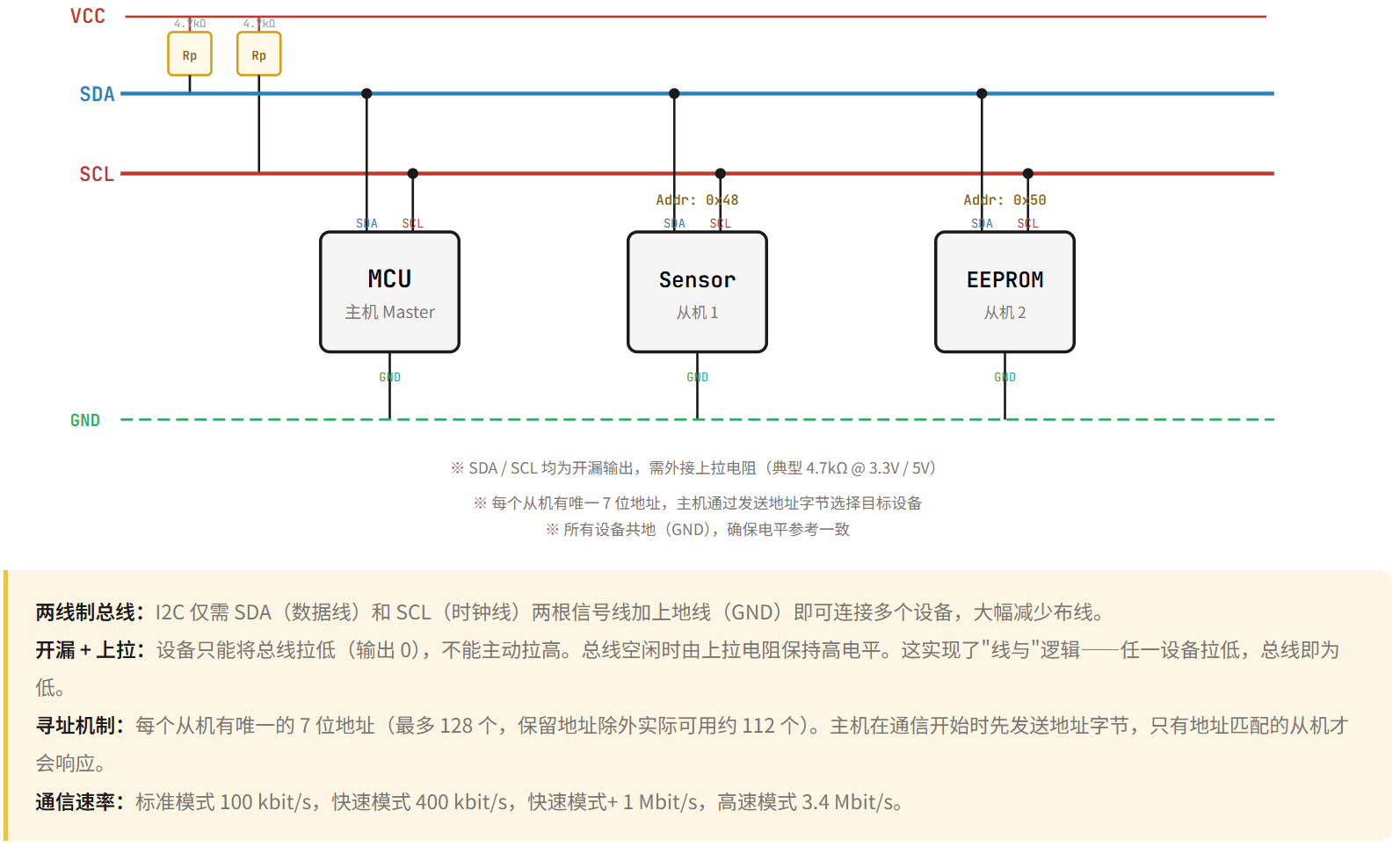 I2C 仅通过一条串行数据线(SDA) 和一条串行时钟线(SCL) 即可在多个设备 间进行同步、半双工的数据传输。I2C 适用于多设备通信,每个设备都有自己的地址(一般是7位),主设备负责产生时钟并发起通信,从设备则响应主设备的请求。I2C 的典型速率包括标准模式(100 kbps)、快速模式(400 kbps)以及更高速模式(如1 Mbps快速模式+和3.4 Mbps高速模式),因引脚少、连接简单且能灵活扩展,I2C被广泛应用于同一电路板内芯片之间的短距离低速通信。