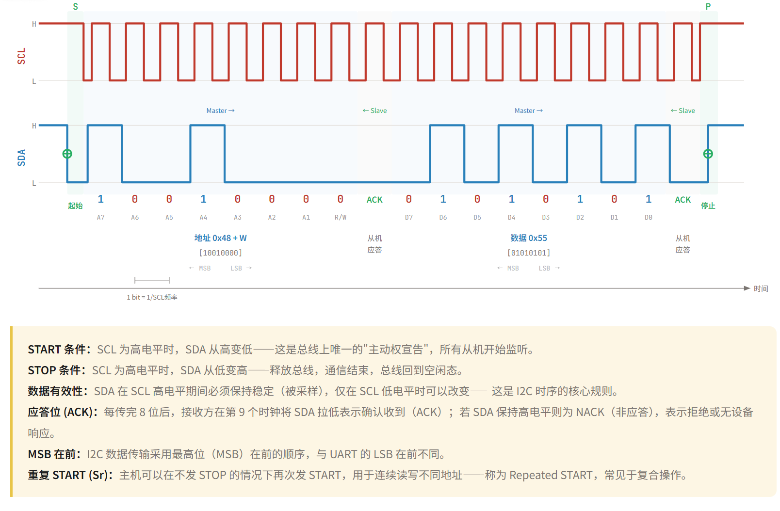 - 起始信号:SCL 为高时,SDA 从高 → 低