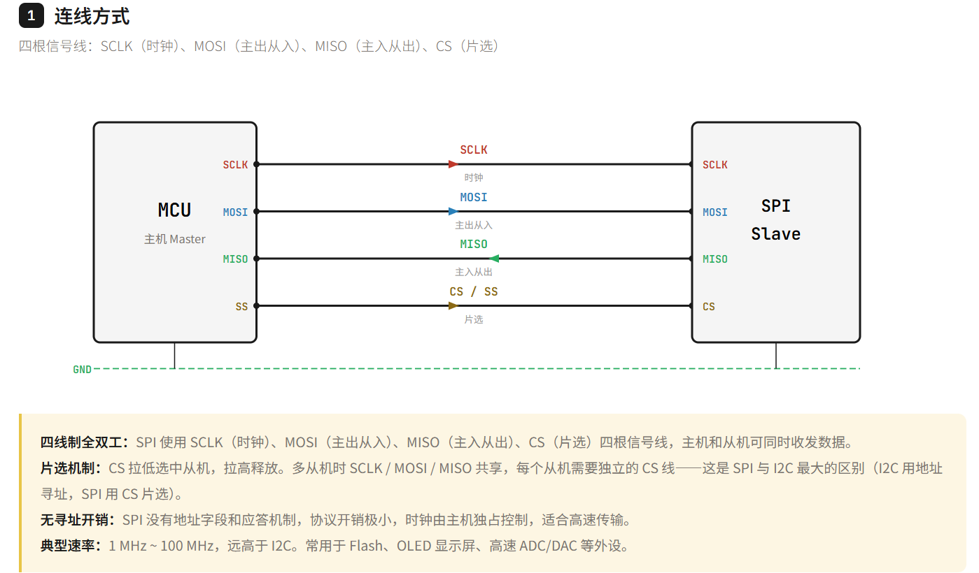 高速应用 (20 MHz - 100 MHz+): 常见于高性能主控与高速存储器(如 QSPI Flash)、以太网控制器(如 W5500)或高分辨率 TFT 液晶屏之间的通信。