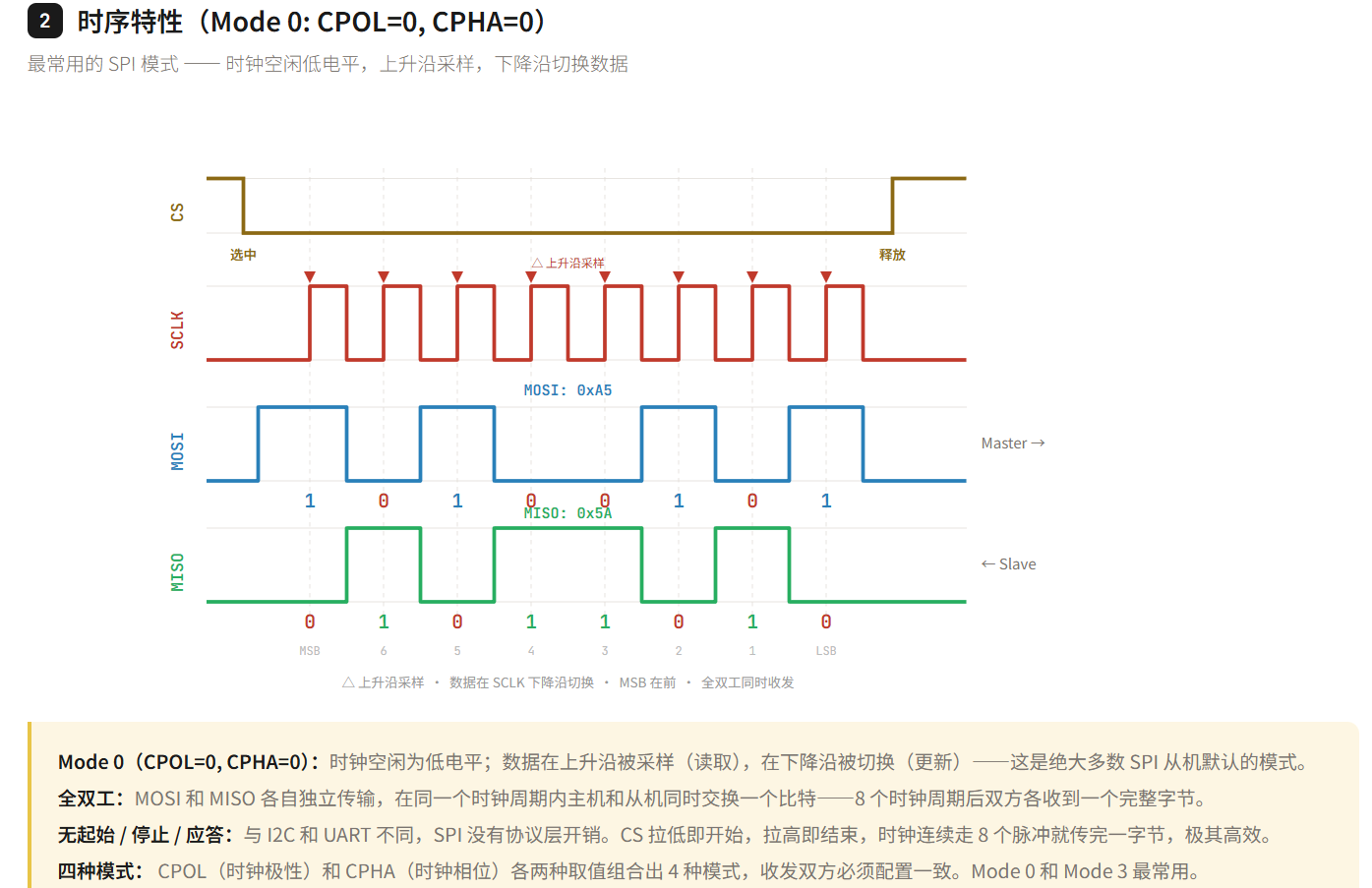 | Mode 0 | 0 | 0 | 空闲时低电平,第一个时钟沿:上升沿 |