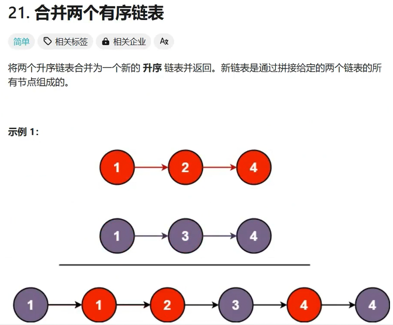 cpptypedef struct ListNode ListNode; struct ListNode * mergewoLists(struct ListNode * list1,struct ListNode * list2) { if(list1 == NULL) { return list2; } if(list2 == NULL) { return list1; } //创建空链表 ListNOde * newHead,*newTail; newHead = newTail = NULL; ListNode * l1 = list1; ListNode * l2 = list2; while(l1 && l2) { if(l1->val < l2->val) { //l1尾插到新链表中 if(newHead == NULL) { newHead = newTail = l1; } else { //链表不为空 newTail->next = l1; newTail = newTail->next; } l1 = l1->next; } else { //l2尾插到新链表中 if(newHead == NULL) { newHead = newTail = l2; } else { //链表不为空 newTail->next = 12; newTail = newTail->next; } l2 = l2->next; } } //要么l1为空,要么l2为空 if(l2) { newTail->next = l2; } if(l1) { newTail->next = l1; } return newHead; }因为代码太过冗余,因此简化为