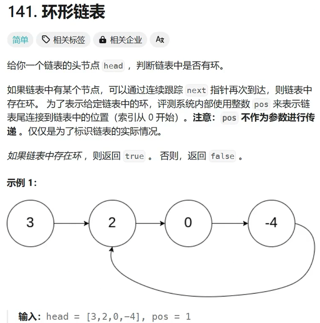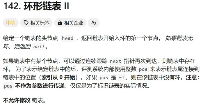 cppstruct ListNode { int val; struct ListNode * next; } typedef struct ListNode ListNode; struct ListNode *deteCycle(struct ListNode * head) { //快慢指针 ListNode * slow = head; ListNode * fast = head; while(fast && fast->next) { slow = slow->next; fast = fast->next->next; if(slow == fast) { //找相遇点 //相遇点和头结点到入环第一个结点距离相等 ListNode * pcur = head; //pcur slow/fast while(pcur != slow) { pcur = pcur->next; slow = slow->next; } //pcur == slow return pcur; } } return NULL; }证明: