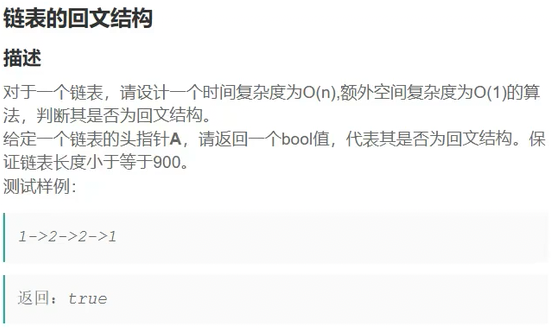 cppbool chkPailndrome(ListNode * A) { //创建数组------900 int arr[900] = {0}; //遍历链表将链表中的值保存在数组中 ListNode * pcur = A; int i = 0; while(pcur) { arr[i++] = pcur->val; pcur = pcur->next; } //判断数组是否为回文结构 int left = 0; int right = i - 1; while(lsft < right) { if(arr[left] != arr[right]) { return false; } left++; right--; } return ture; }这种方法治标不治本