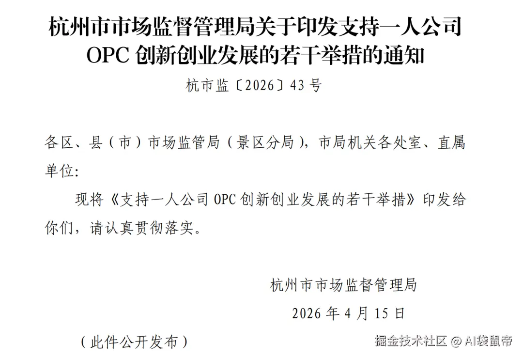2026年1月15日,深圳印发了打造人工智能OPC创业生态引领地行动计划。 到了2026年4月15日,杭州市市场监督管理局印发了支持一人公司OPC创新创业发展的若干举措,这是浙江市场监管系统首份OPC专项规范性文件。