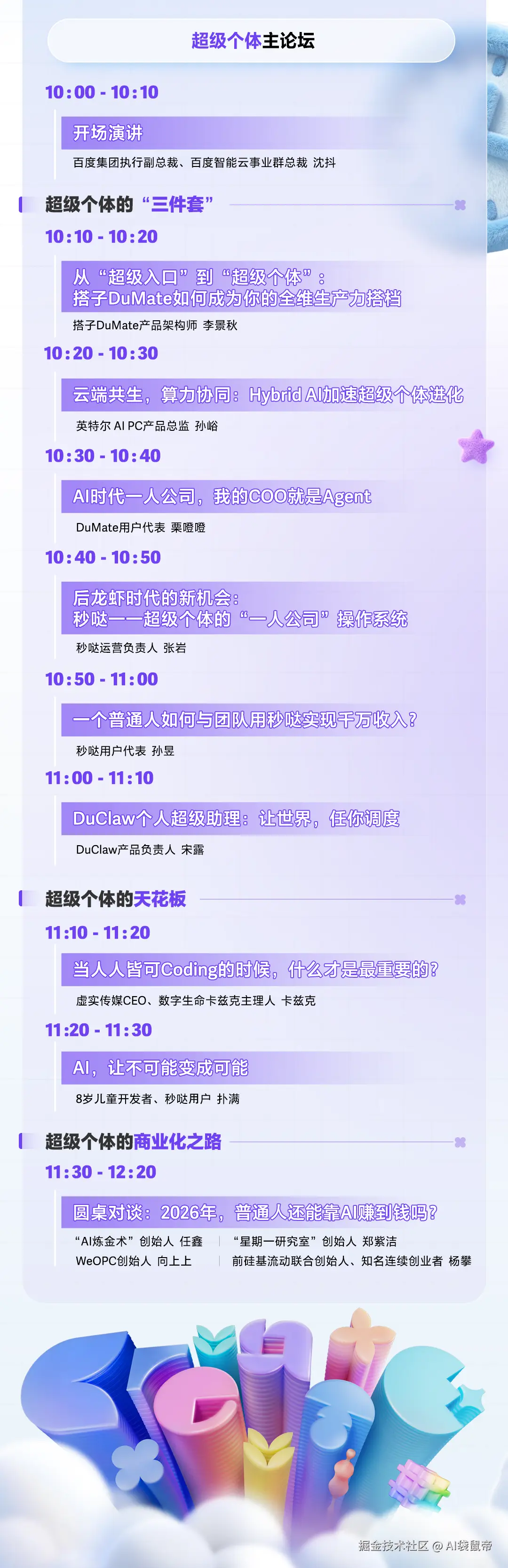 最后 如果你也对超级个体、一人公司以及AI工具究竟如何帮助普通人创造价值这件事感兴趣,可以关注一下5月13日的百度Create大会,这次大会专门设立了超级个体主论坛(我也报名参加了)。
