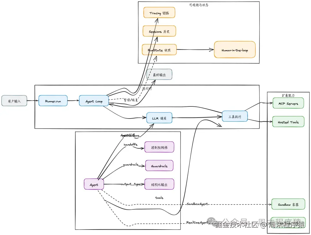 把前面列的所有原语放一起:Agent、SandboxAgent、RealtimeAgent、Handoff、Agent.as_tool、FunctionTool、HostedMCPTool、MCPServer、InputGuardrail、OutputGuardrail、ToolGuardrail、RunState、Session、Tracing、RunContextWrapper。