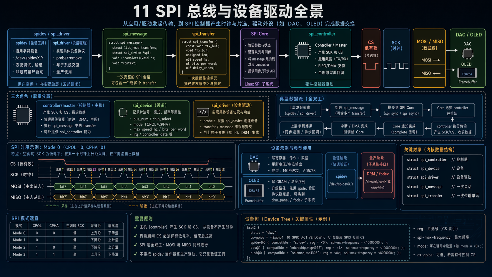 11_SPI 是这套课里非常关键的一章,因为它第一次把"总线协议、设备树、用户态验证、设备驱动、子系统改造、控制器驱动"放进了同一条学习链里。