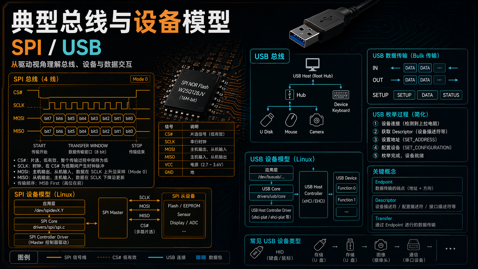 这篇文章整理自课程第 11-12 章。SPI 和 USB 一个强调板上总线与设备树,一个强调枚举与主机/设备双视角,合在一起很适合建立"总线 + 设备 + 驱动 + 用户接口"的整体感觉。