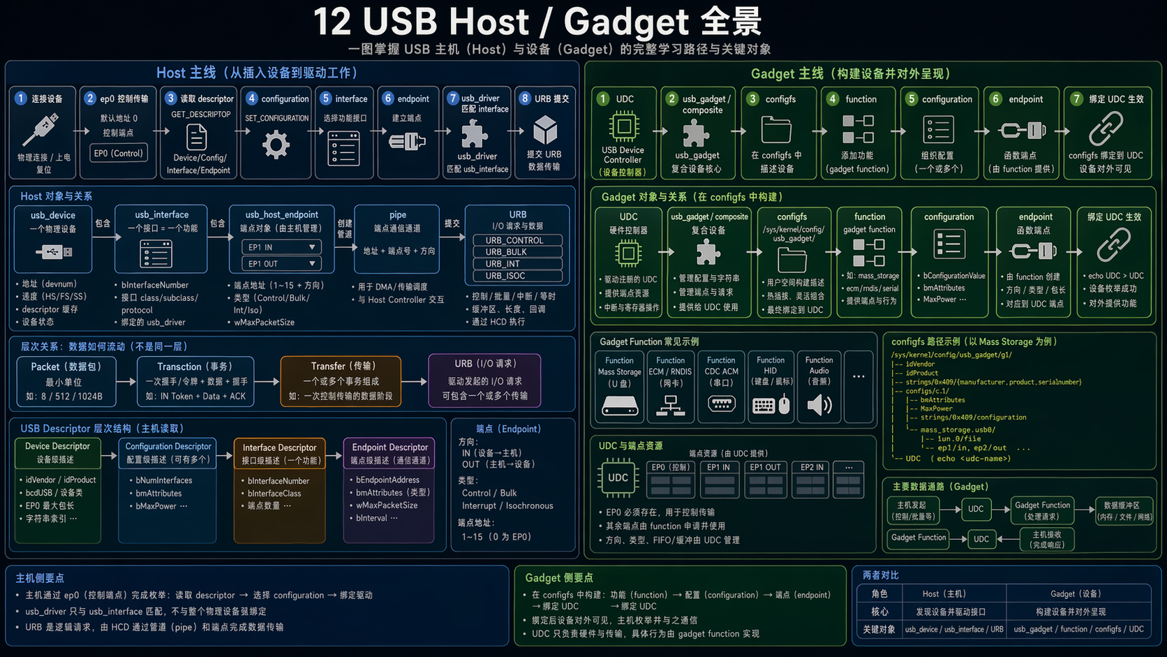 如果把这章学扎实,后面你再看 USB 摄像头、USB 网卡、Android ADB、USB 串口,都会更容易抓住主线:先分清自己站在 Host 还是 Device 一边,再看描述符、接口、端点和数据路径。