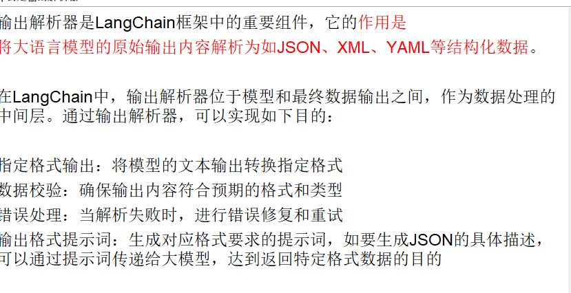这一部分,其实我们只需要将大模型的内容给它就行。但过程是这样的:我们先需要利用JsonOutputParser()这个类去构建一个对象,然后通过这个对象去调用invoke()方法,把大模型的一堆输出他。他就可以解析出来值。