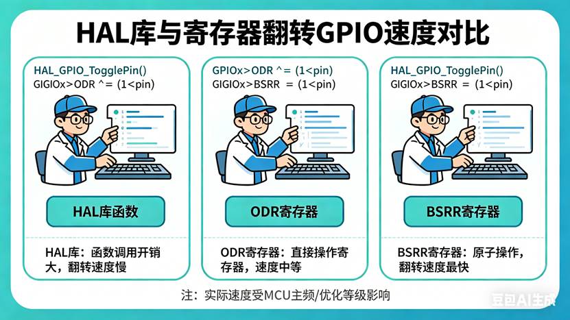 你有没有想过一个问题:同样是翻转GPIO引脚,用HAL库、用ODR寄存器、用BSRR寄存器,速度能差多少?教程中用示波器实测了三种方法:
