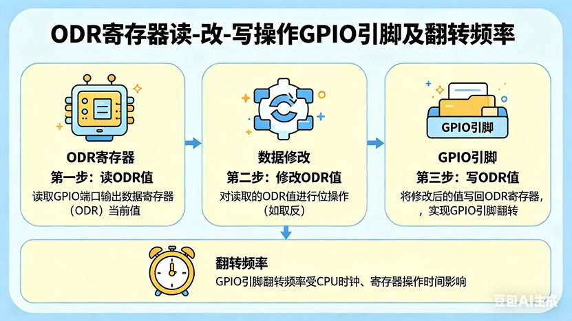 一条GPIO操作,背后是一堆指令。 教程中用示波器测量:HAL库方式翻转频率约1-3MHz 。**那个"读-改-写"的ODR(对应教程3.15节)**直接操作ODR寄存器: