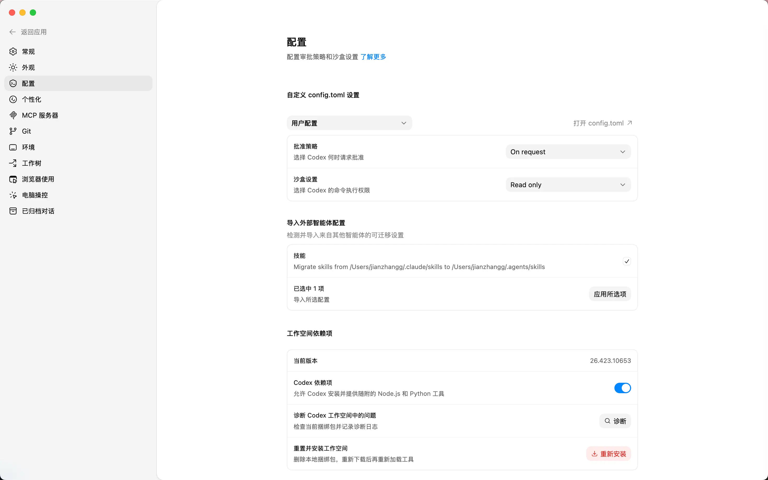 配置页是最容易把人看晕的一块,但核心可以拆成四部分:批准策略、沙盒设置、外部智能体配置、工作空间依赖项。