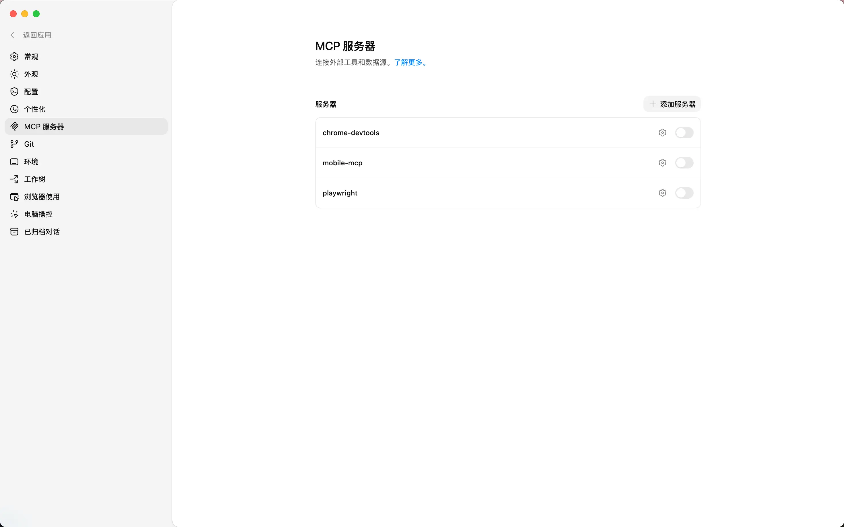 这一页是管理 MCP 服务器的地方,也就是把外部能力接进 Codex 的一种方式。