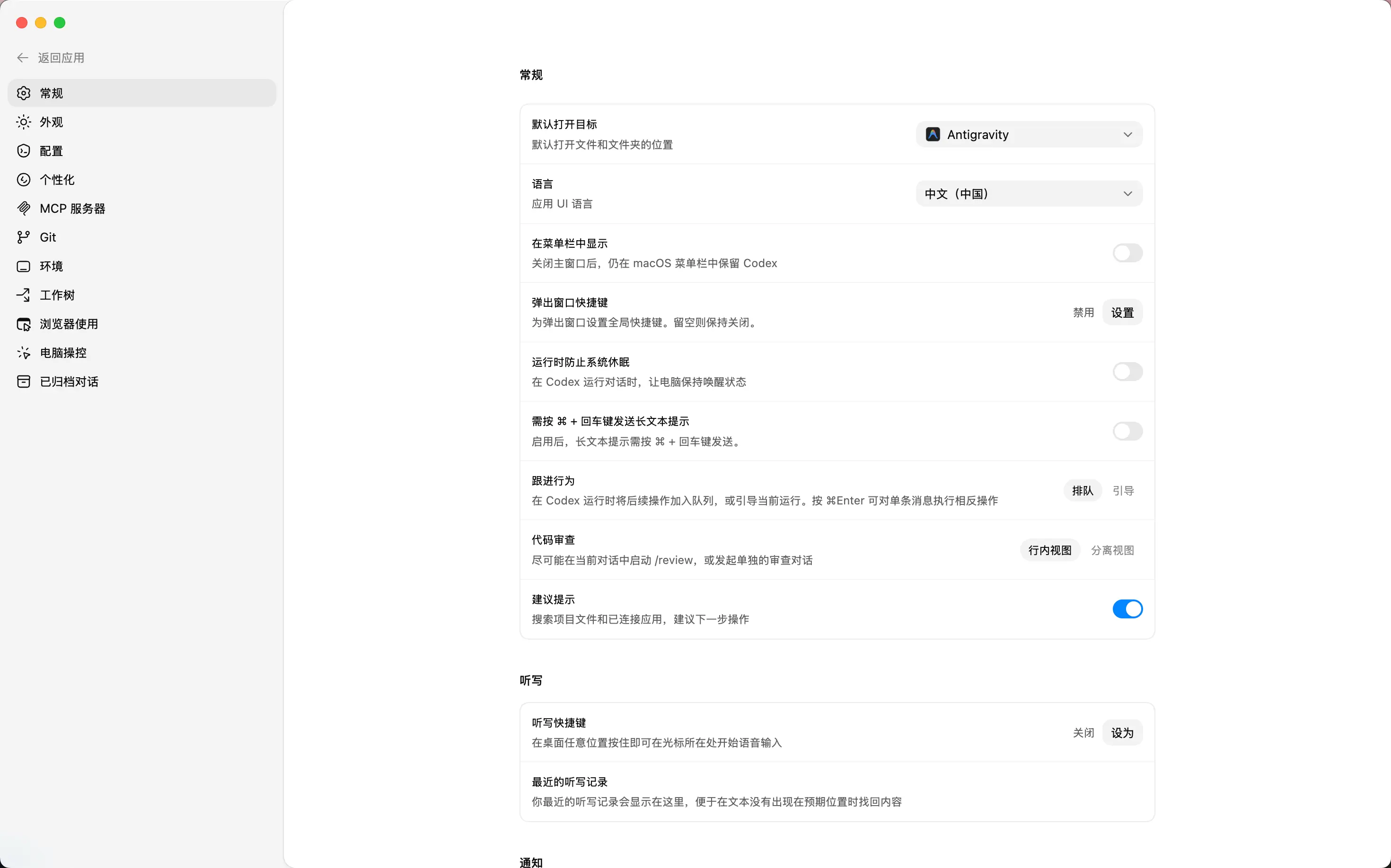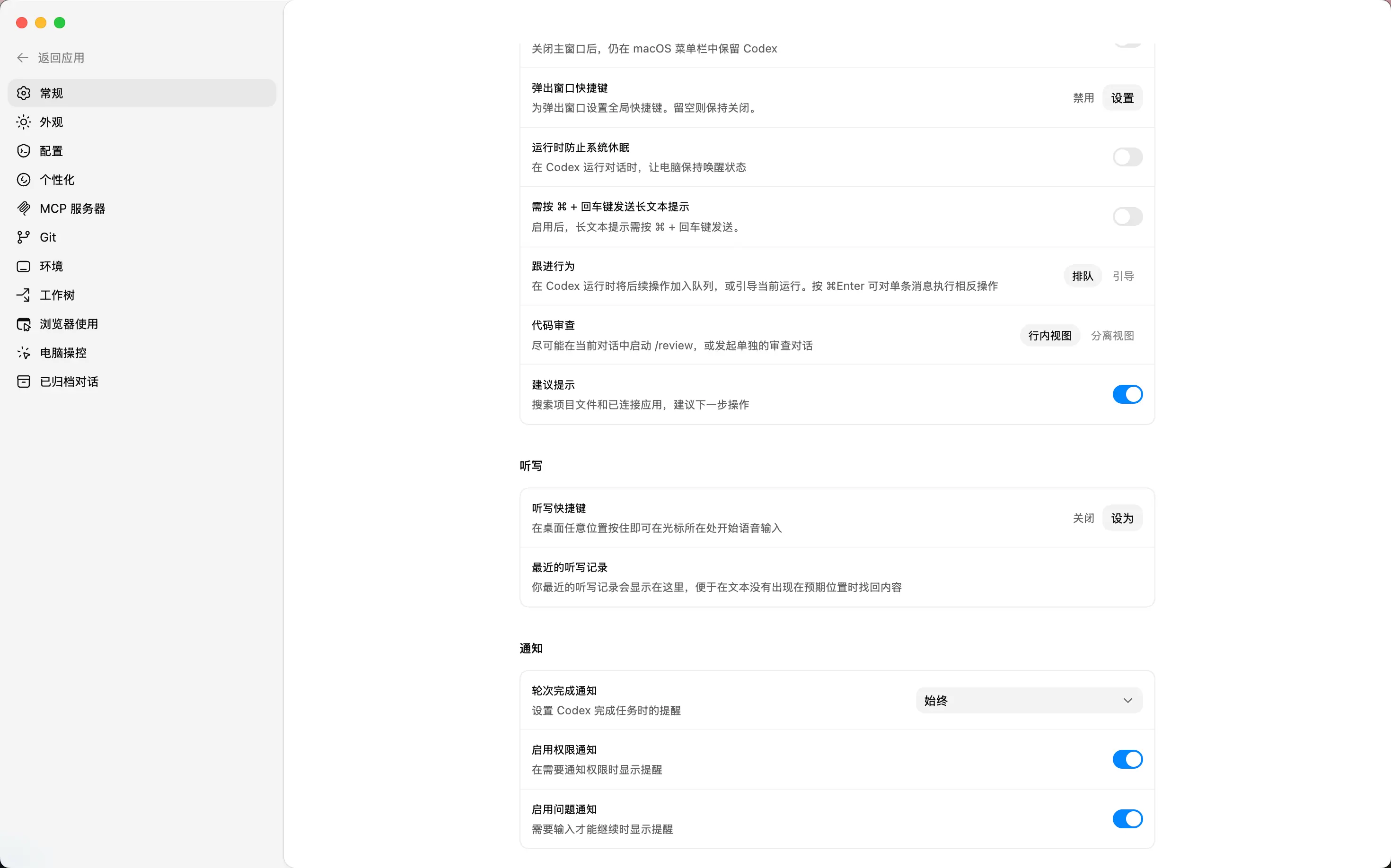 - 弹出窗口快捷键:设置一个快捷键,用来快速呼出 Codex 的迷你窗口。
