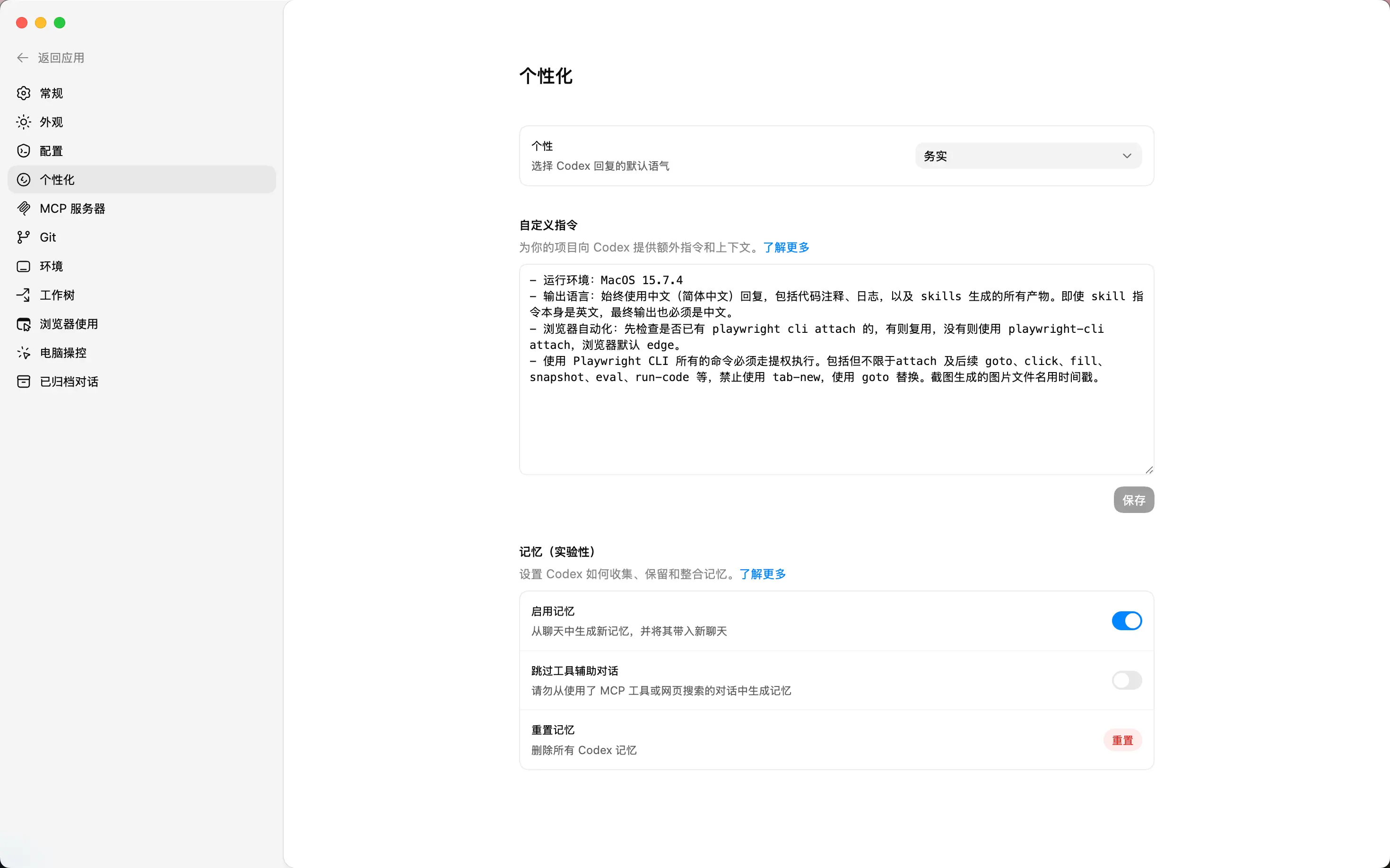 这里通常可以设置 Codex 默认的表达风格,例如更亲和,或者更务实。
