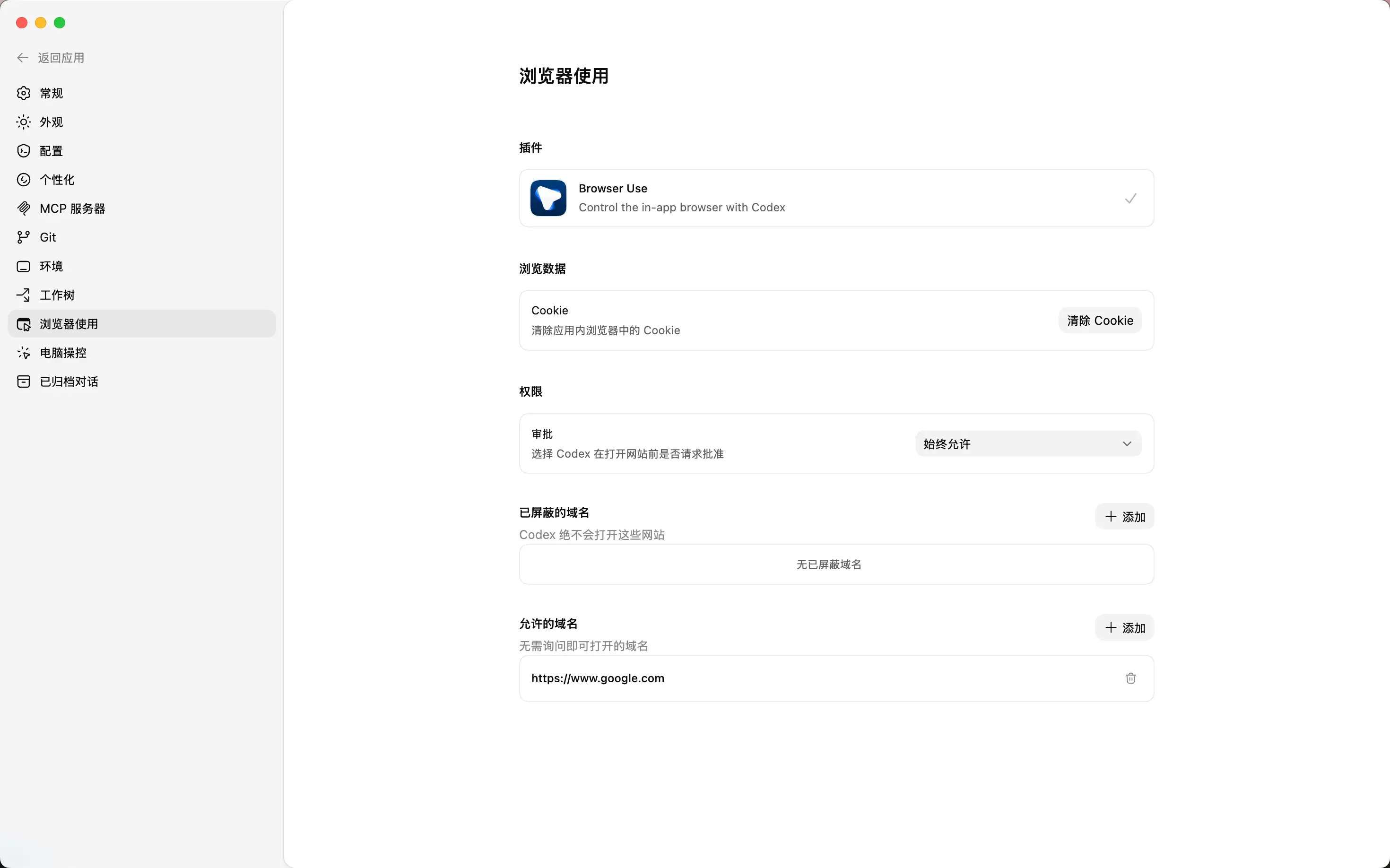 Browser Use 是 Codex 官方提供的浏览器操作能力。你可以把它理解成"内置浏览器自动化"。