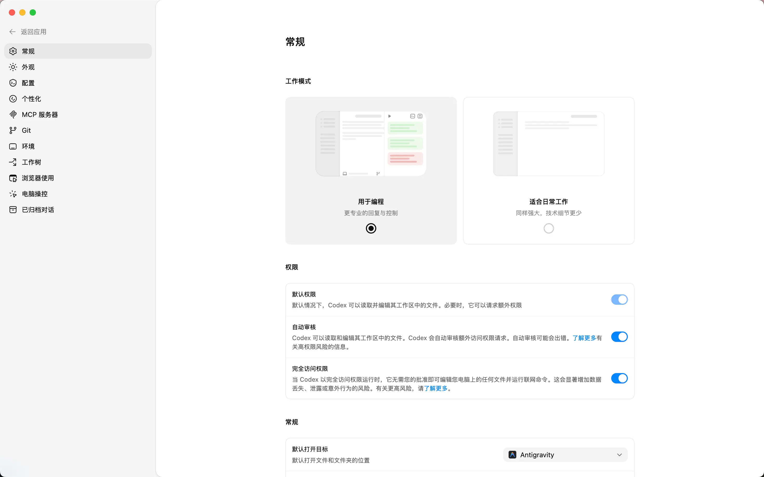 - 默认打开位置:决定从 Codex 打开文件或项目时,默认交给哪个本地应用处理。